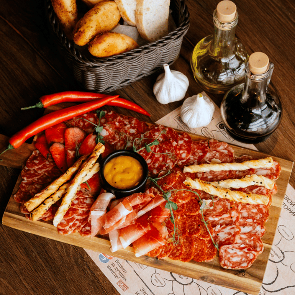 Нарезка из мяса и колбас, соус горчичный, зелень, гриссини